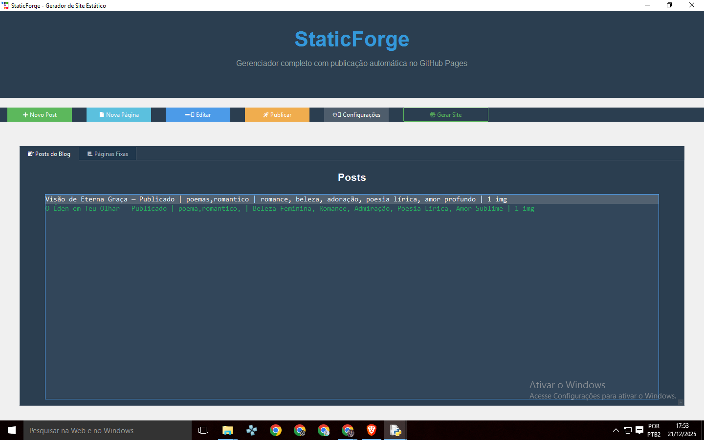 staticforge.exe(Windows) ou rode com Python. - Crie posts e páginas com imagens, tags e categorias.